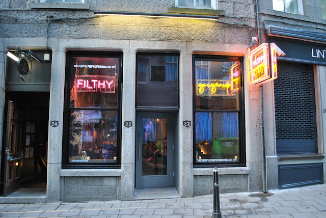 Filthy Gorgeous is the brain child of Darren Blackburn who lives his life commuting from Edinburgh to Glasgow to Aberdeen. He has previous experience in all walks of restaurant life, from pizza hut, to Rosette achieved restaurants. He wanted to bring the dirty burger to Aberdeen but he wanted to put his own spin on it and you really can tell this by looking at the menu, the little touches of marshmallows with fries (yes, you read that right) or the addition of cereal in with the burgers! But the interior is not that of a dive bar, it's indie, kitch and very unique with the addition of a photo booth!